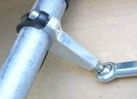 Another view of the temporary clamp on the handlebars. The key to it is that the rod-end bearing at that end of the steering link is aligned with the axis of the power axle/bearing. The back-andforth power strokes don't affect steering. |