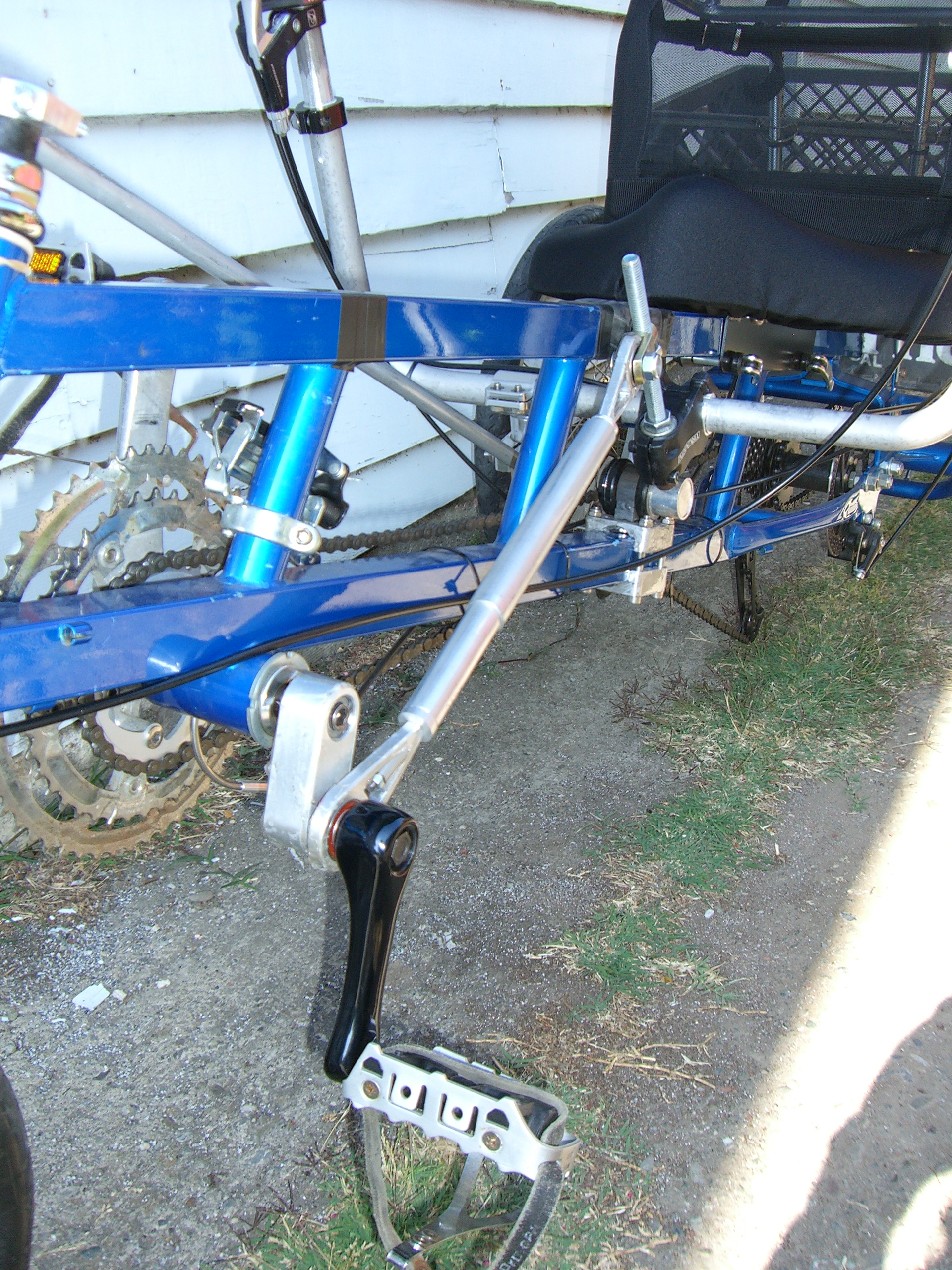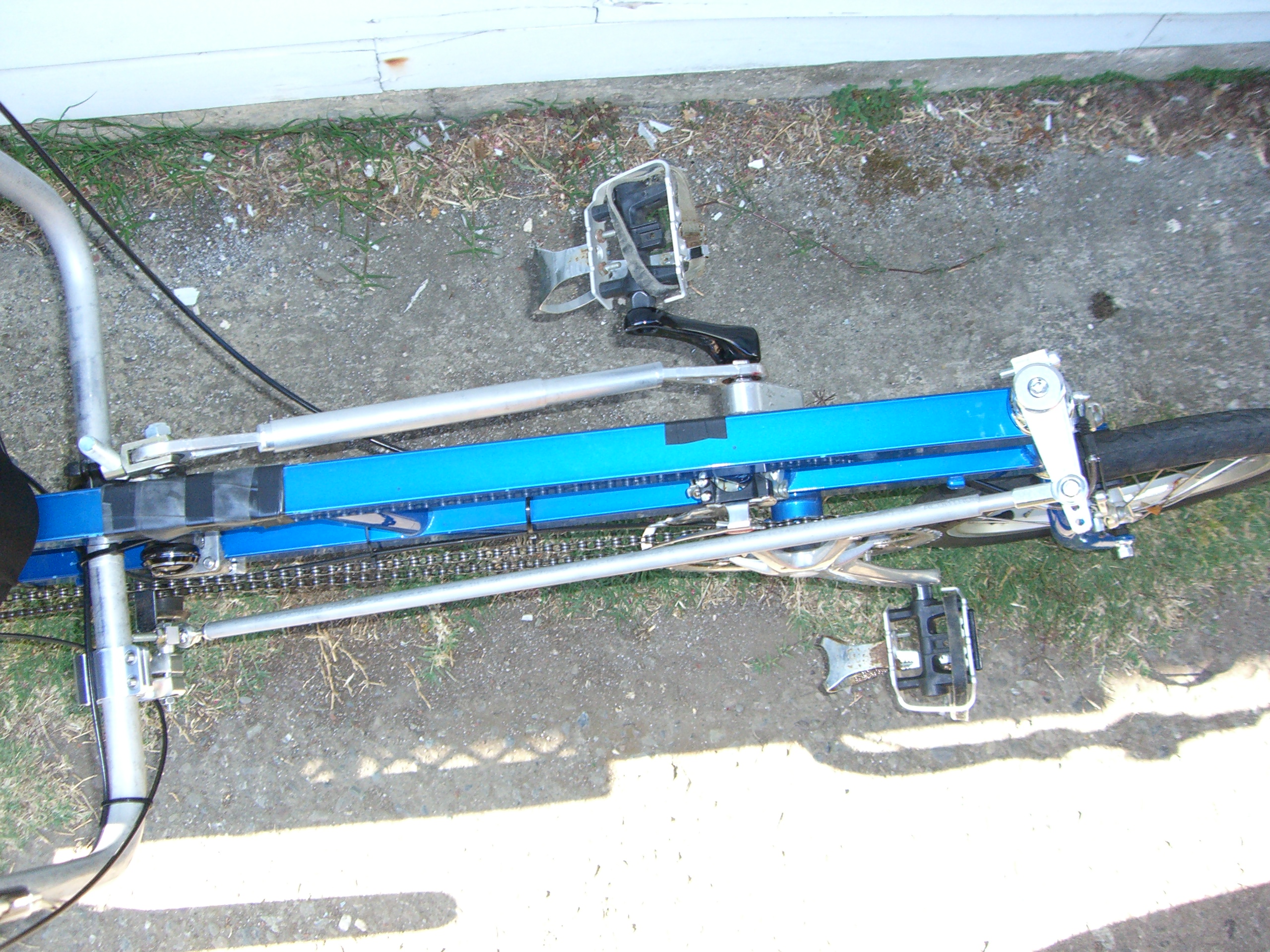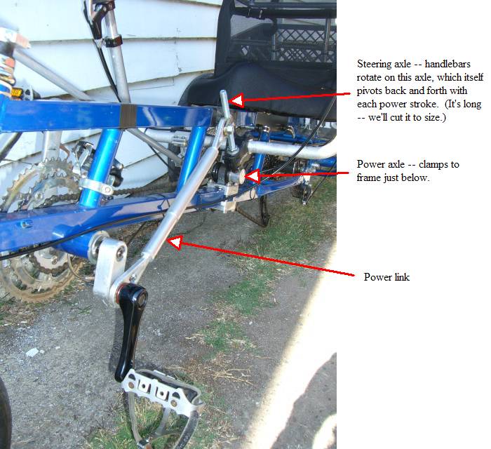 This top view shows the power link on the left side of the bike, and the steering link on the right side. The steering arm goes in place of the normal stem.
