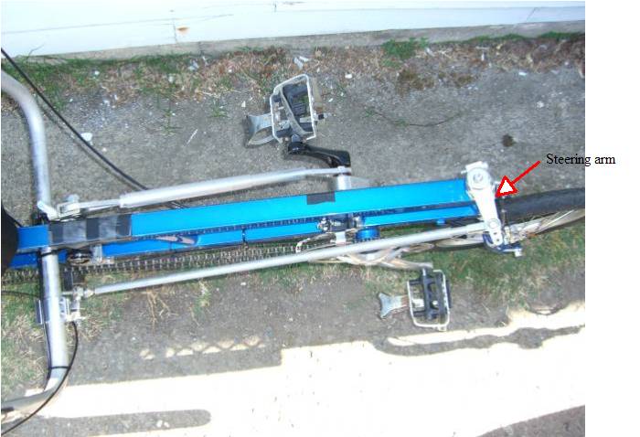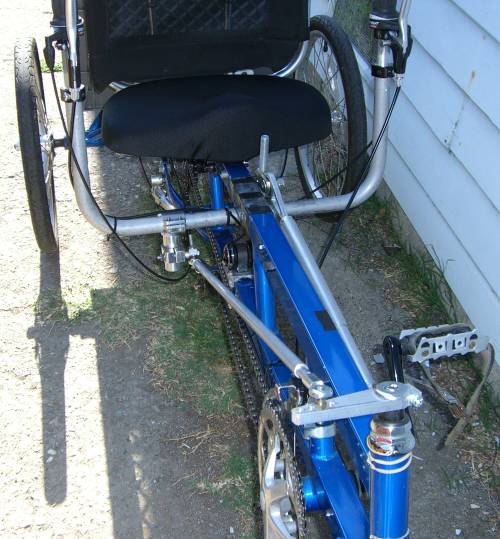 This top view shows the power link on the left side of the bike, and the steering link on the right side. The steering arm goes in place of the normal stem.